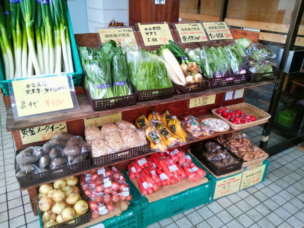 『駅前直売所八〇八』の店頭には無農薬・無化学肥料栽培の野菜が並ぶ